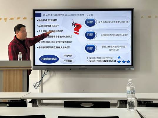黄逸哲首先分析了国家自然科学基金申请不中的主要原因以及申报前需要思考的几个问题。并从申请书的题目、摘要、立项依据、特色与创新之处等方面详细分享了申报经验。与会教师分别就研究基础、题目拟定、特色与创新之处等进行了提问与交流,现场气氛轻松热烈。